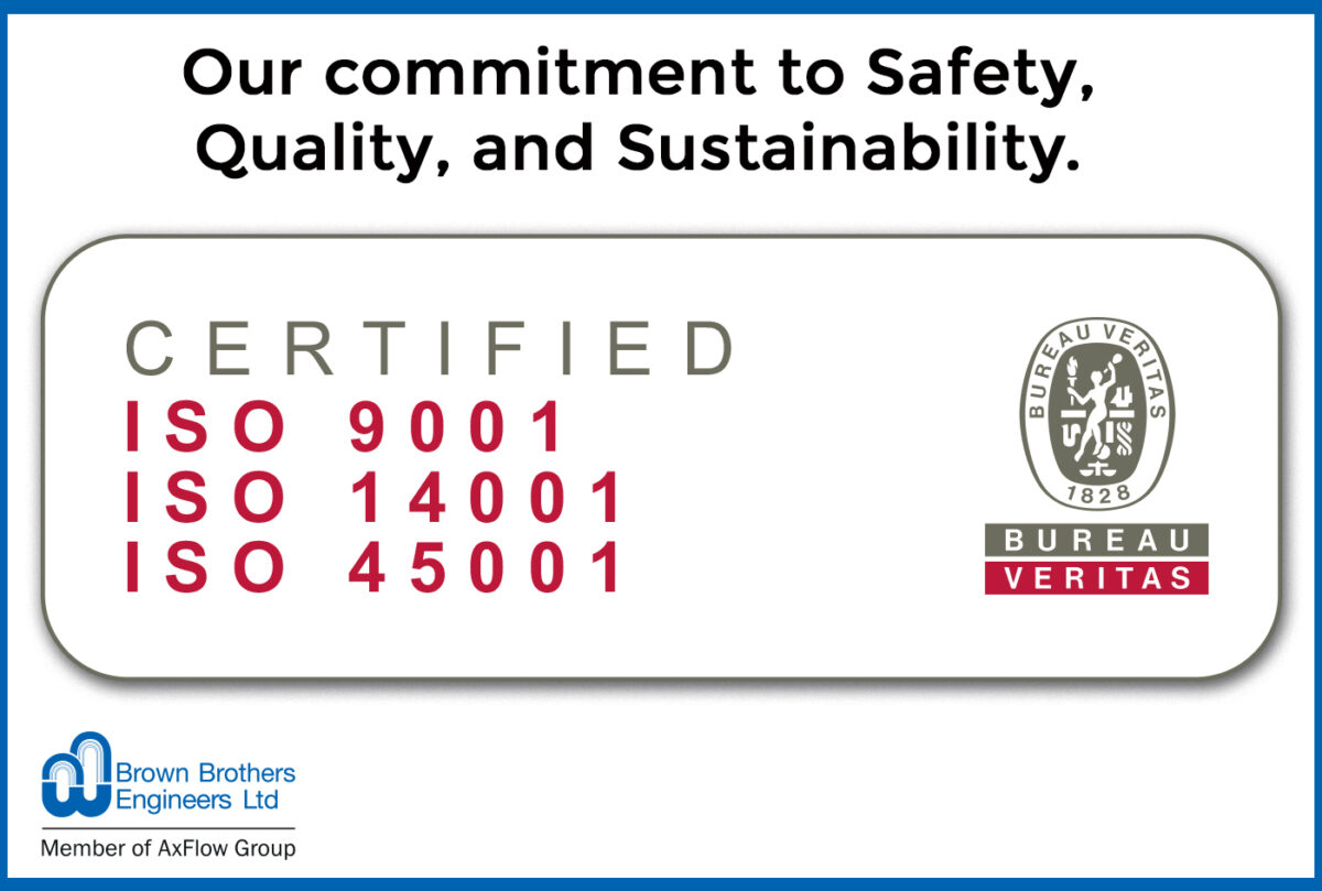 At Brown Brothers Engineers, we are committed to providing reliable, high-quality, and sustainable pumping solutions. To reinforce this commitment, we have been awarded three globally recognised ISO certifications, demonstrating our dedication to best practices in quality management, environmental sustainability, and workplace safety.